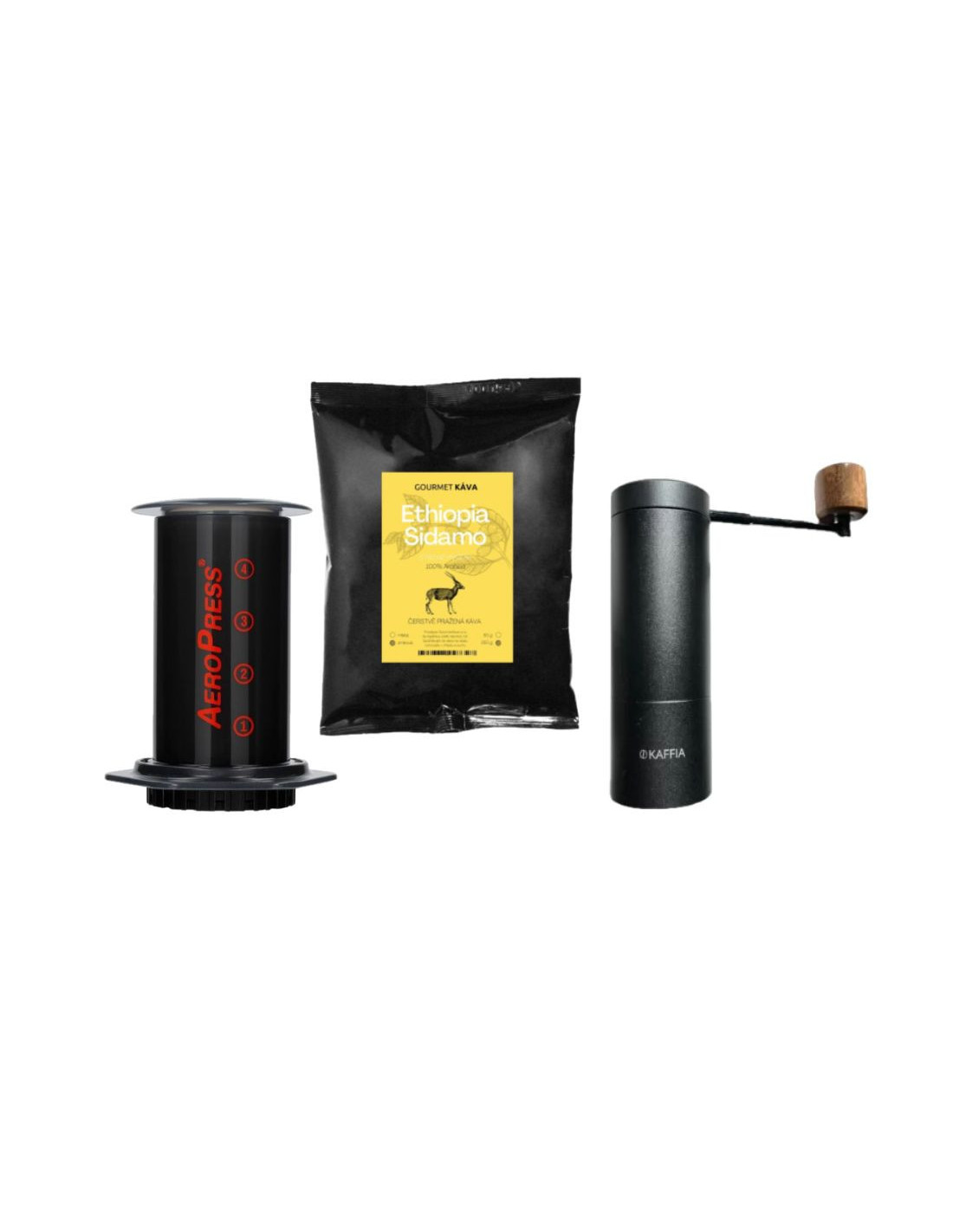 Friss kávé Etiópia Sidamo, Közepesen pörkölt 250g, Aeropress Aerobie kávéfőző és Kaffia Barista X kávédaráló mint egy trió, amely népszerű a utazók körében, valamint más kávérajongók között.