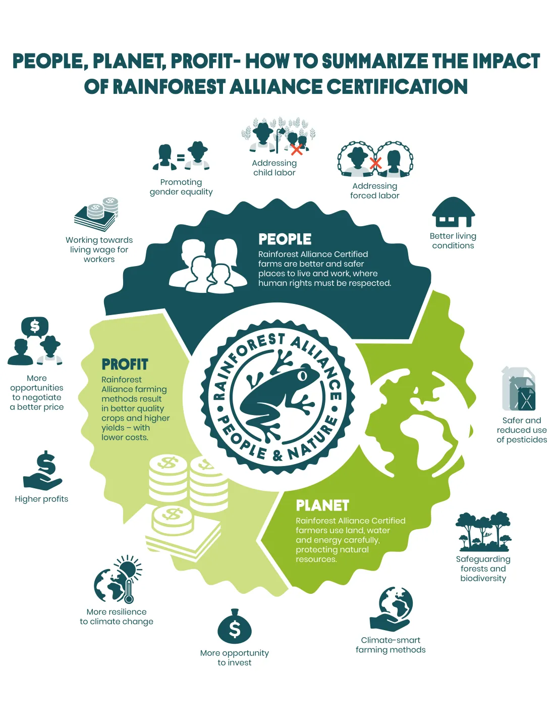 A New York-i székhelyű Rainforest Alliance non-profit szervezet olyan kávétermesztőknek és -termelőknek ítéli oda a tanúsítványait, akiknek termesztési módszerei megfelelnek az ökológiai és társadalmi kritériumoknak . Ezek a kritériumok a környezet, a biológiai sokféleség és a munkavállalók jogainak védelmét szolgálják.