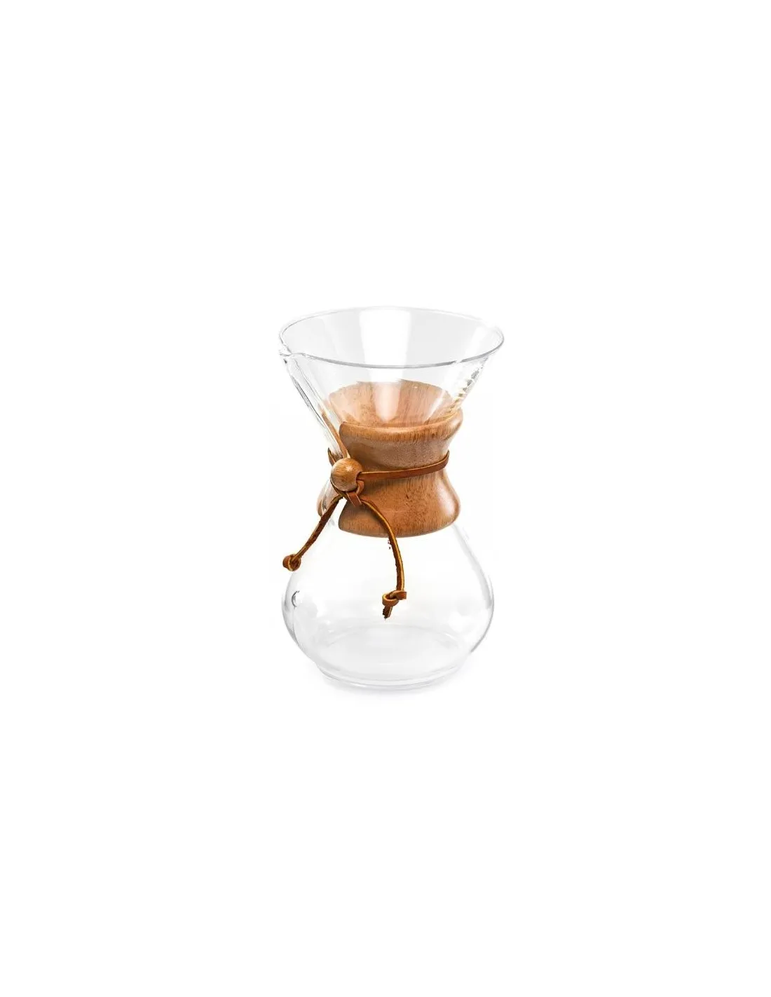 AChemex, amely első pillantásra egy vízkaraffára hasonlít, boroszilikát üvegből készült, és középen egy fából készült fűzőt tartalmaz, amelyet egy bőrszíj tart a helyén.