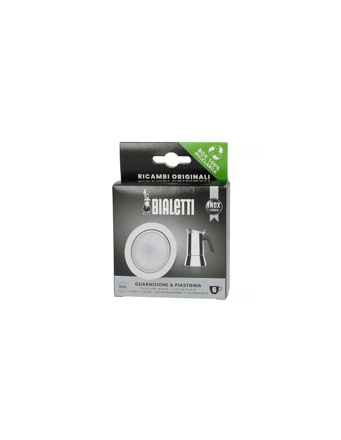 A csomag tartalmaz 1x tartalék szilikon tömítést a Bialetti rozsdamentes acél mokkáskannákhoz 6 csésze méretben és 1x tartalék rozsdamentes acél szűrőt.