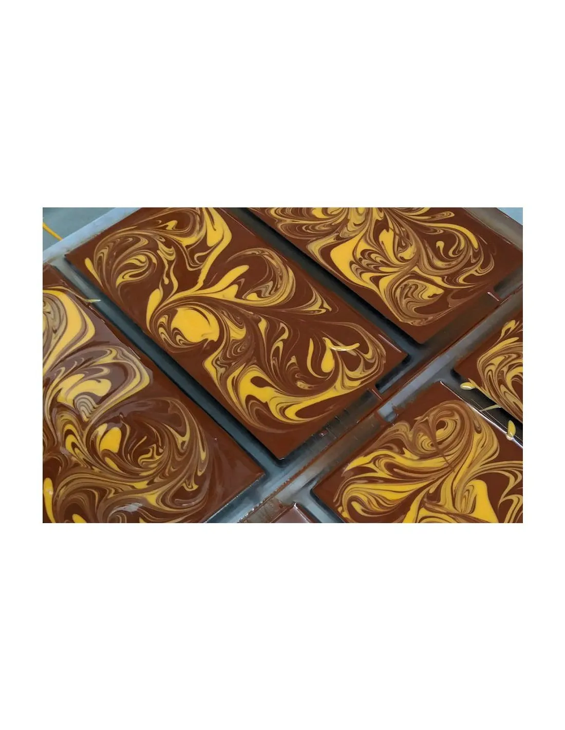 A tanzániai bio kakaóbabból készült 65%-osétcsokoládé kézzel díszített fehér csokoládéval és cseh csipkebogyóval. Minőségét megőrzi: 2025.10.09.