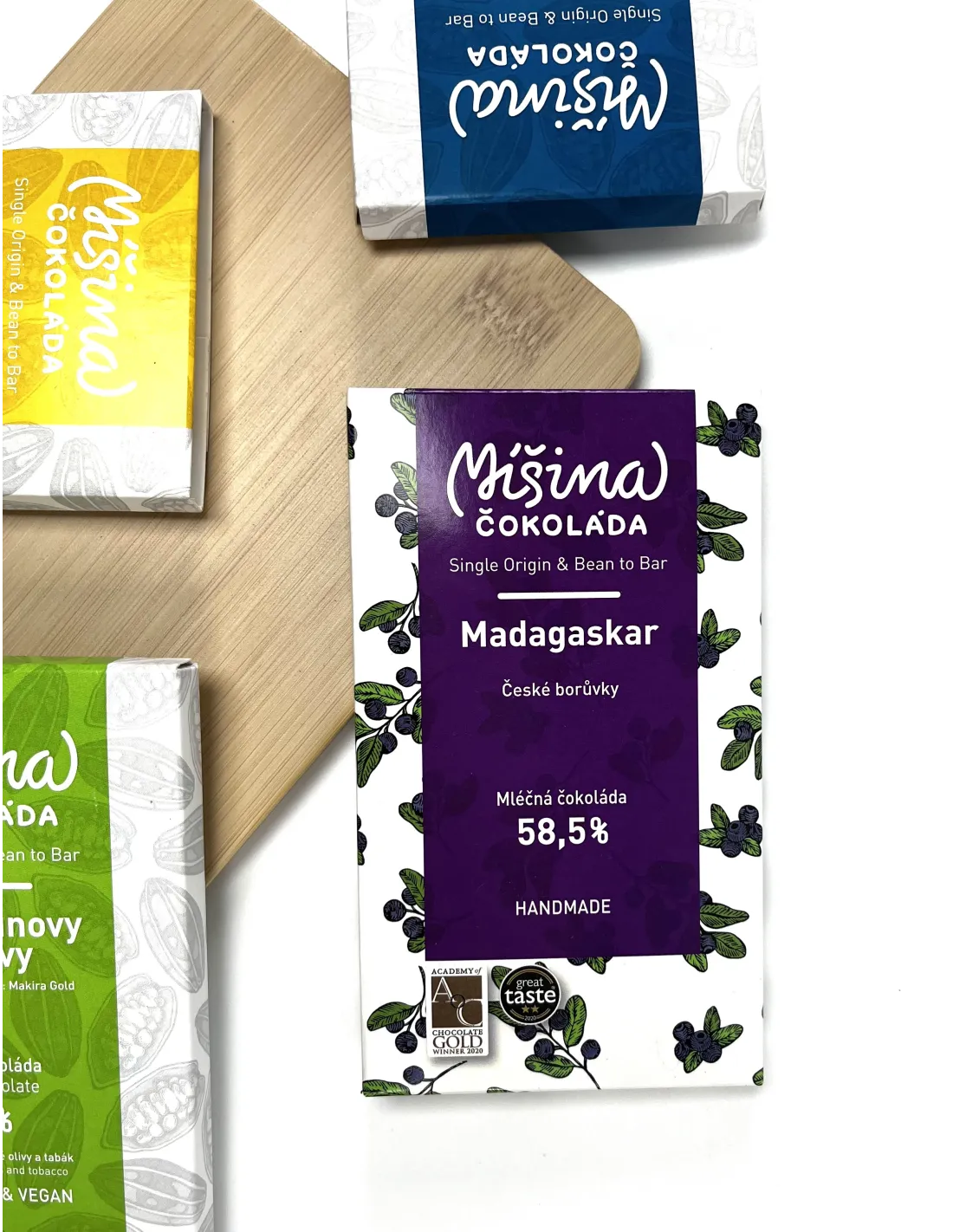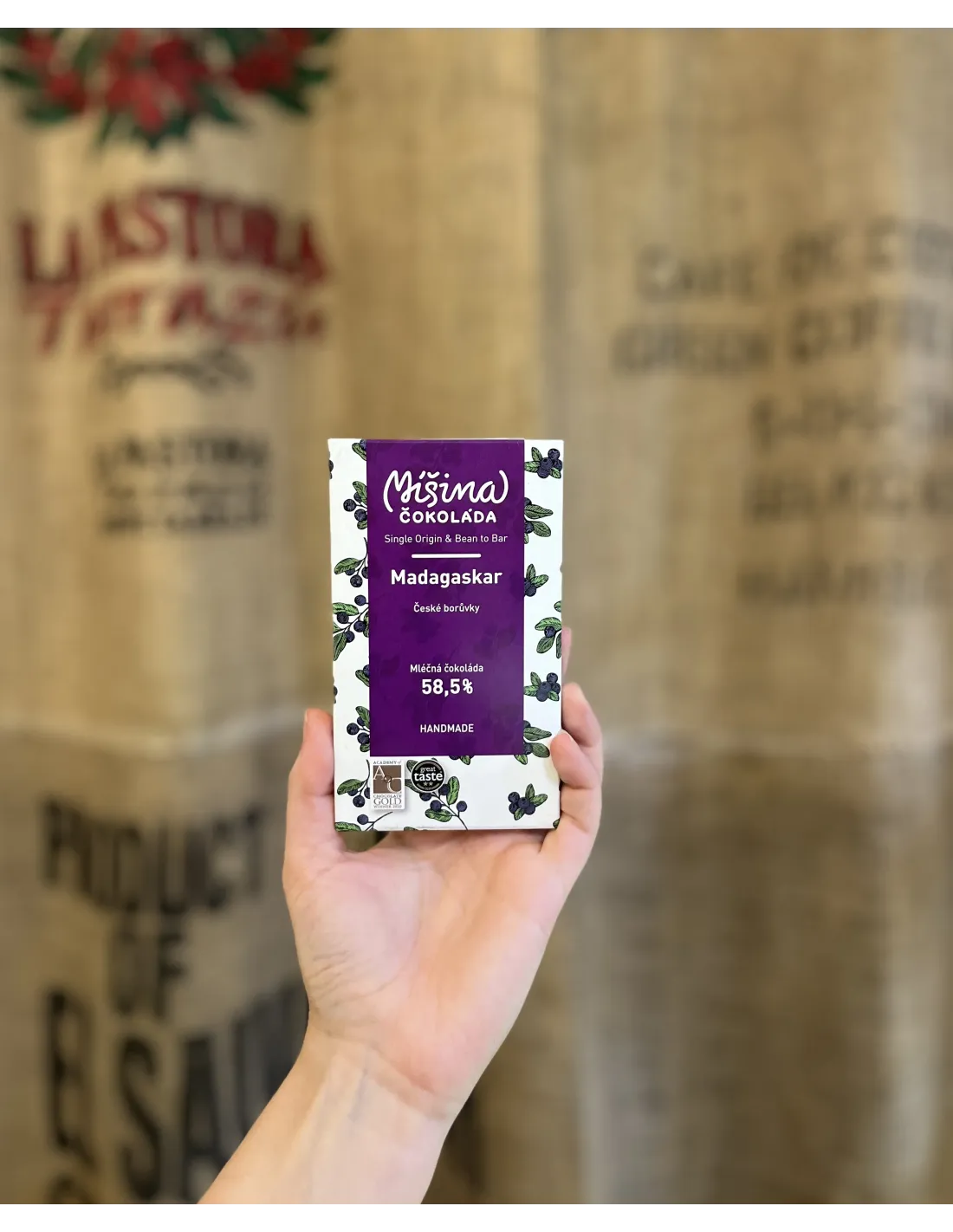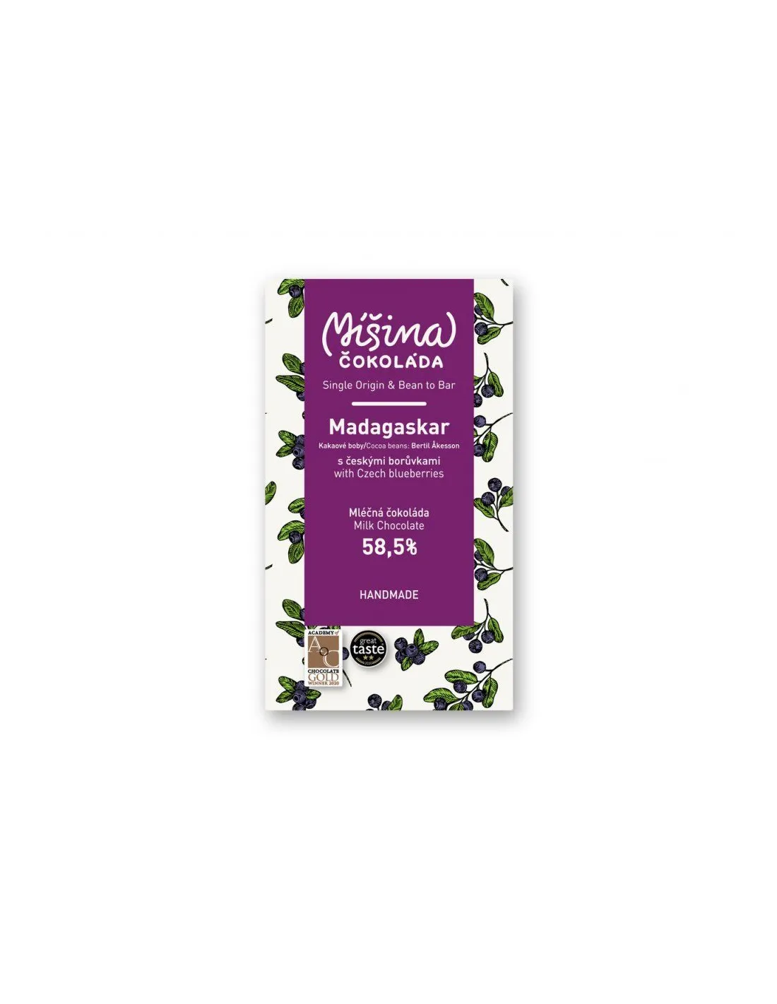 Madagaszkári bio kakaóbabból készülttejcsokoládé. Ezeknek a baboknak olyan az ízük, mint a gyümölcsöknek, és a cseh erdőkből származó áfonyát is hozzáadtak.