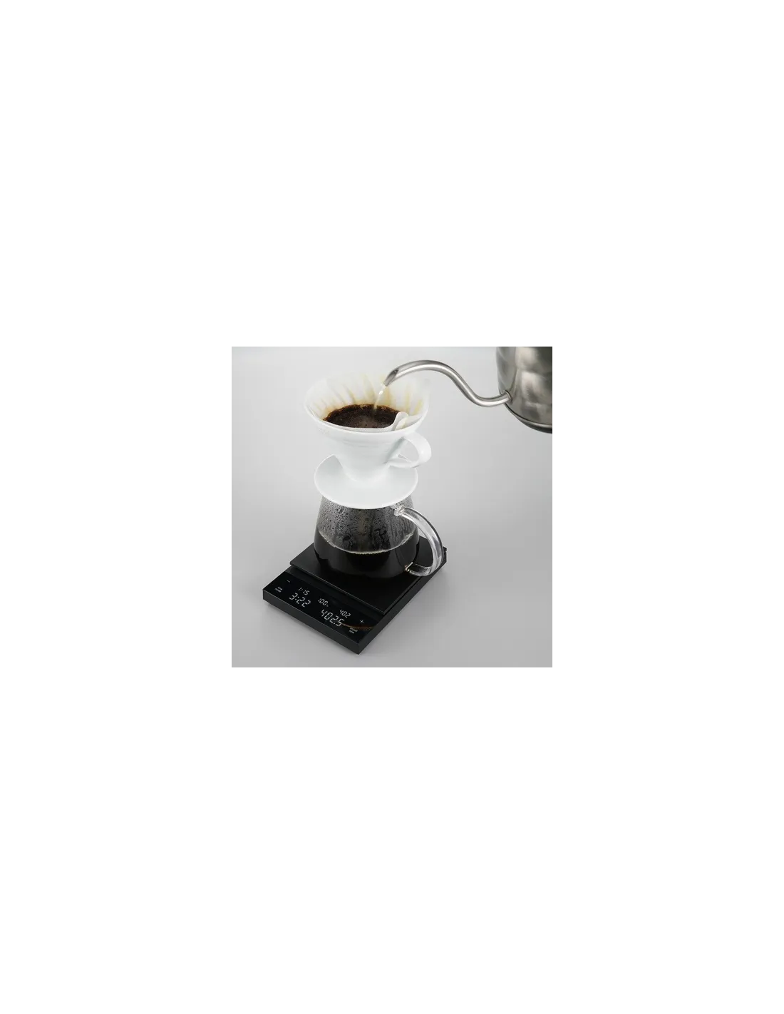 A mérleg minimalista és elegáns dizájnjával, kiváló minőségű anyagokkal és minden részletének precíz kidolgozásával nyűgöz le. A ház sima, matt műanyagból készült, ami hozzájárul a tisztaság és a modern megjelenés általános benyomásához. Kompakt méreteinek köszönhetően a mérleg könnyen befogadja az olyan tartozékokat, mint a Chemex, a csepegtető vagy az AeroPress.