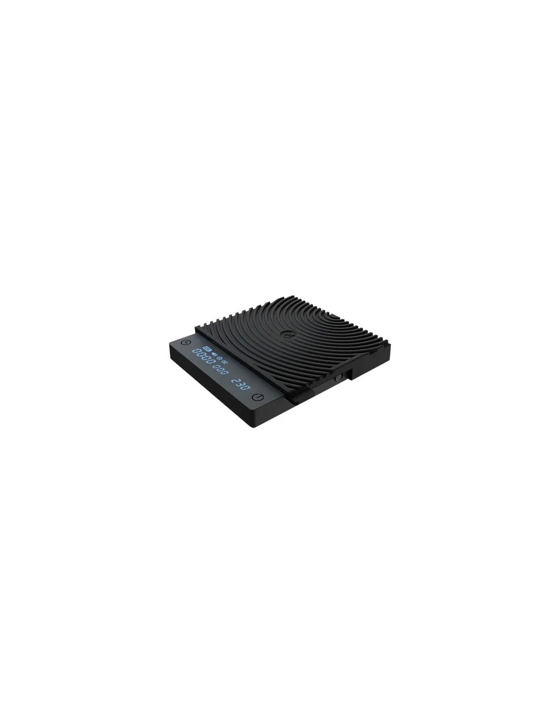 Minimalista, elegáns és modern megjelenésű Timemore Mini Espresso mérleg, kiváló minőségű anyagokkal és minden részletre odafigyelve. A test sima, matt fekete műanyagból készült - az adatok láthatatlanok, amíg meg nem érinti a panelt, és az fel nem világít. A mérleg vezérlése az érintőpanelen található két gombbal történik. A mérleg teteje vízálló. Ahogy az USB-C port is, a töltéshez, a szilikon vízálló kupaknak köszönhetően.