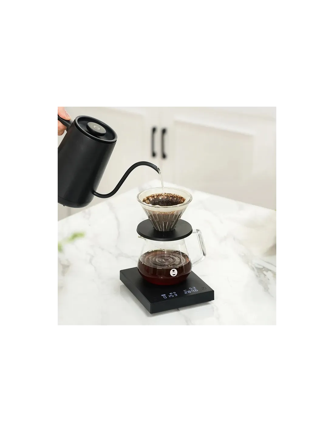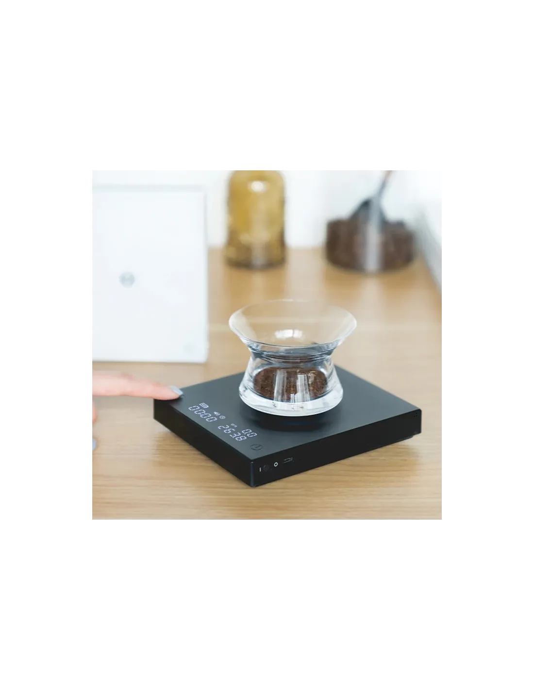 A stílusos Timemore Mirror Basic PRO digitális mérleg új modellje fekete színben, minimalista funkciókkal és elegáns dizájnnal ideális asszisztens az otthoni és professzionális eszpresszó készítéshez vagy a pour-over módszerekhez, mint a Chemex, a dripper vagy az AeroPress.