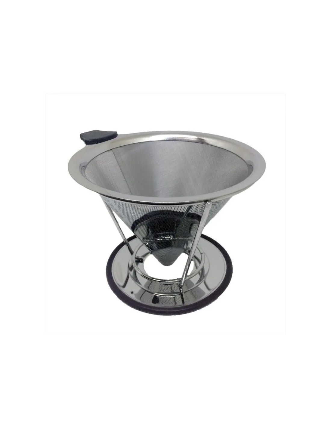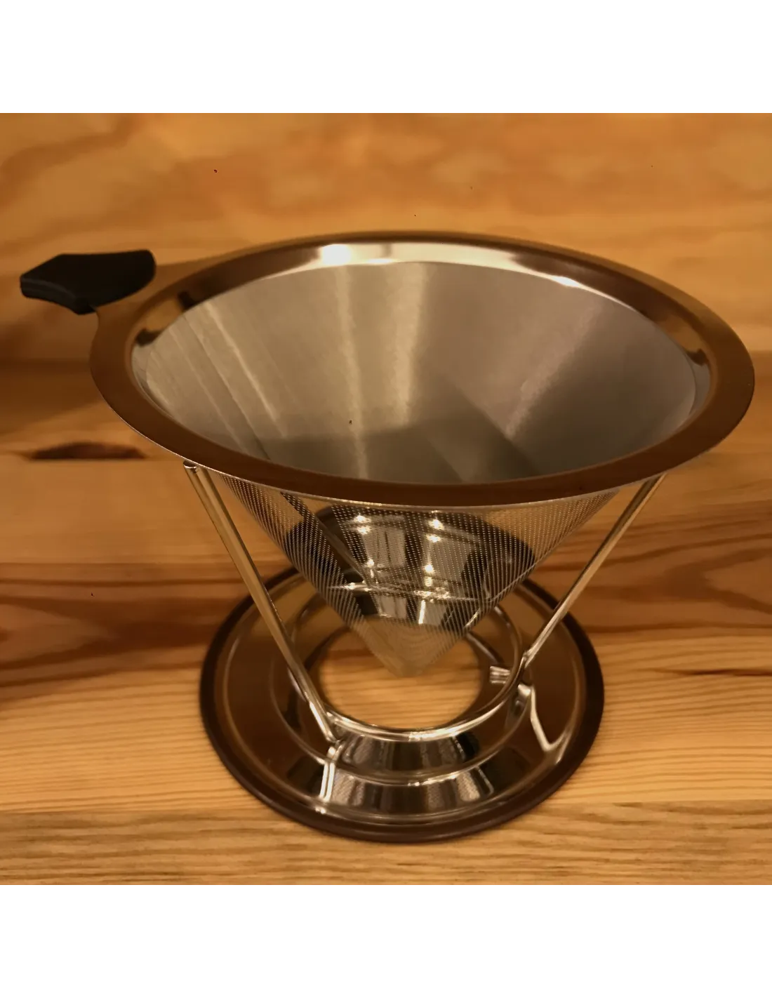 A csepegtető fémszűrőből áll vastag szitával és műanyag fogantyúval a tetején és egy fém állvány. Maga a fémszűrő ezért kávéfőzés közben felemelhető/megfogható a kézben, vagy az állványon hagyható, amely a szűrőt klasszikus csepegtetővé alakítja. Köszönöm ez a design a címen elkerülheti, hogy állandóan papírszűrőket kelljen vásárolniaamely mindkettő sokkal gazdaságosabb és környezetbarátabb megoldás is..