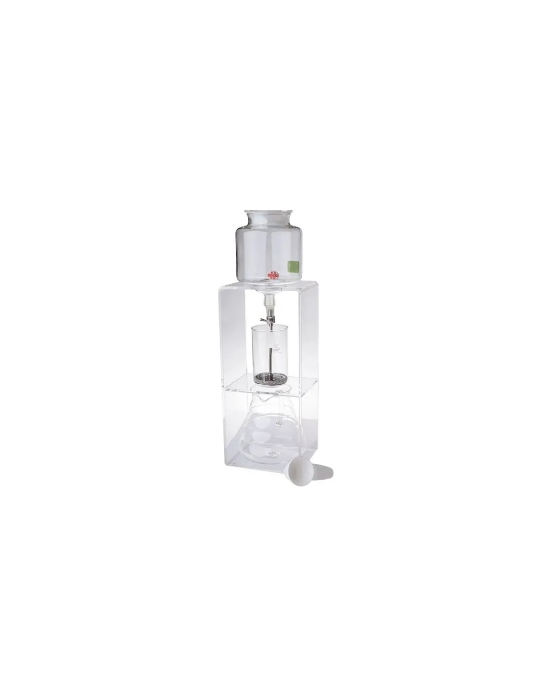 A felső tartályban hideg víz van, amely a rozsdamentes acél szűrőn keresztül lassan csöpög az alsó tálalóedénybe. A fémszelep segítségével könnyen beállítható a víz áramlási sebessége. A szűrés a szelep beállításától és az Ön ízlésétől függően több órát is igénybe vehet. Az ideális beállítás az 1 csepp/másodperc áramlási sebesség. Egy teli tartály szűrése körülbelül 5 óra alatt történik meg. A kávé durvaságával is kísérletezhet.