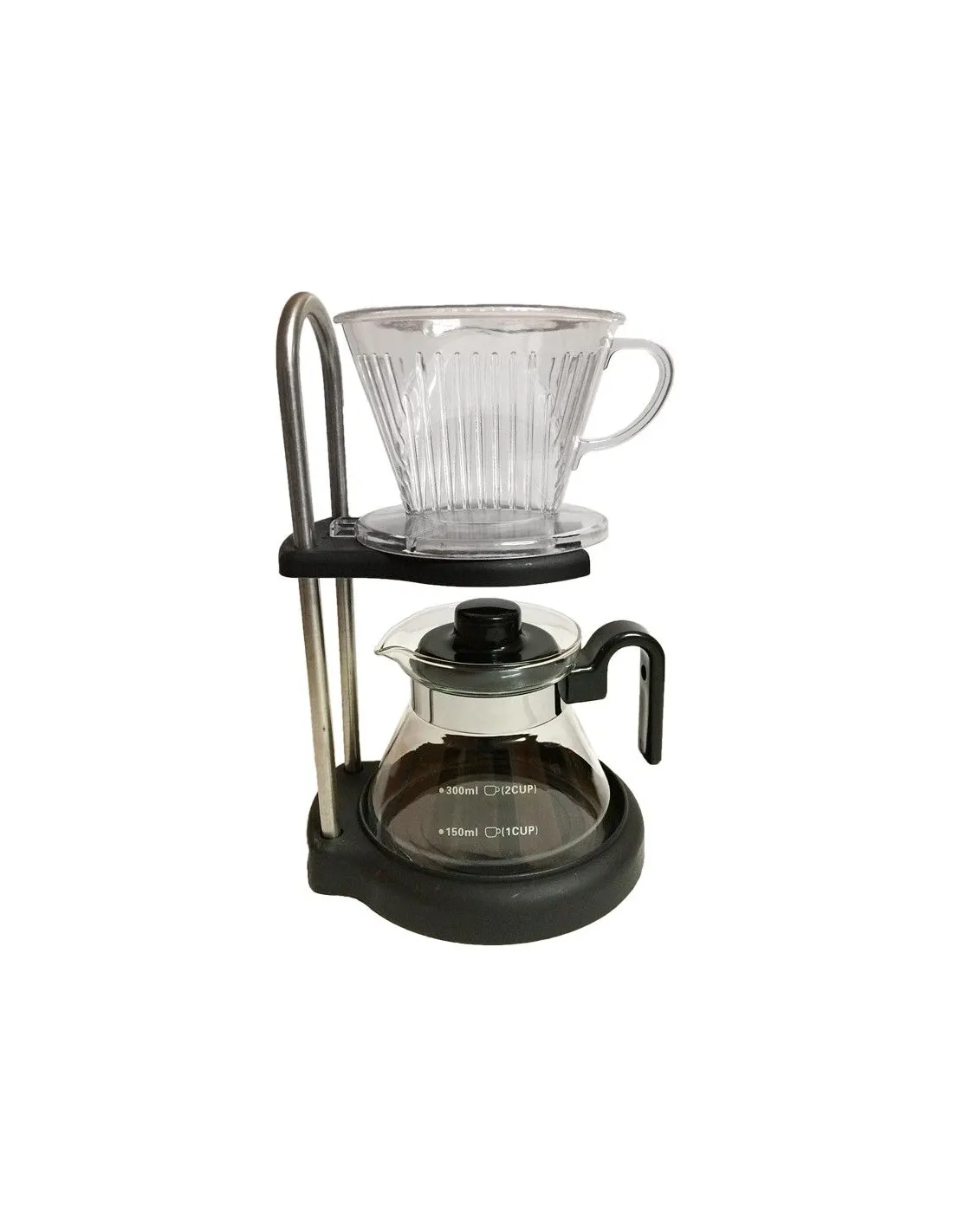 A Kaffia Pour Over készlet 1-3 csészére tartalmaz egy üveg teáskannát, egy műanyag csepegtetőt 1-3 csészére és egy praktikus állványt. Minden, ami a friss filterkávé elkészítéséhez szükséges.