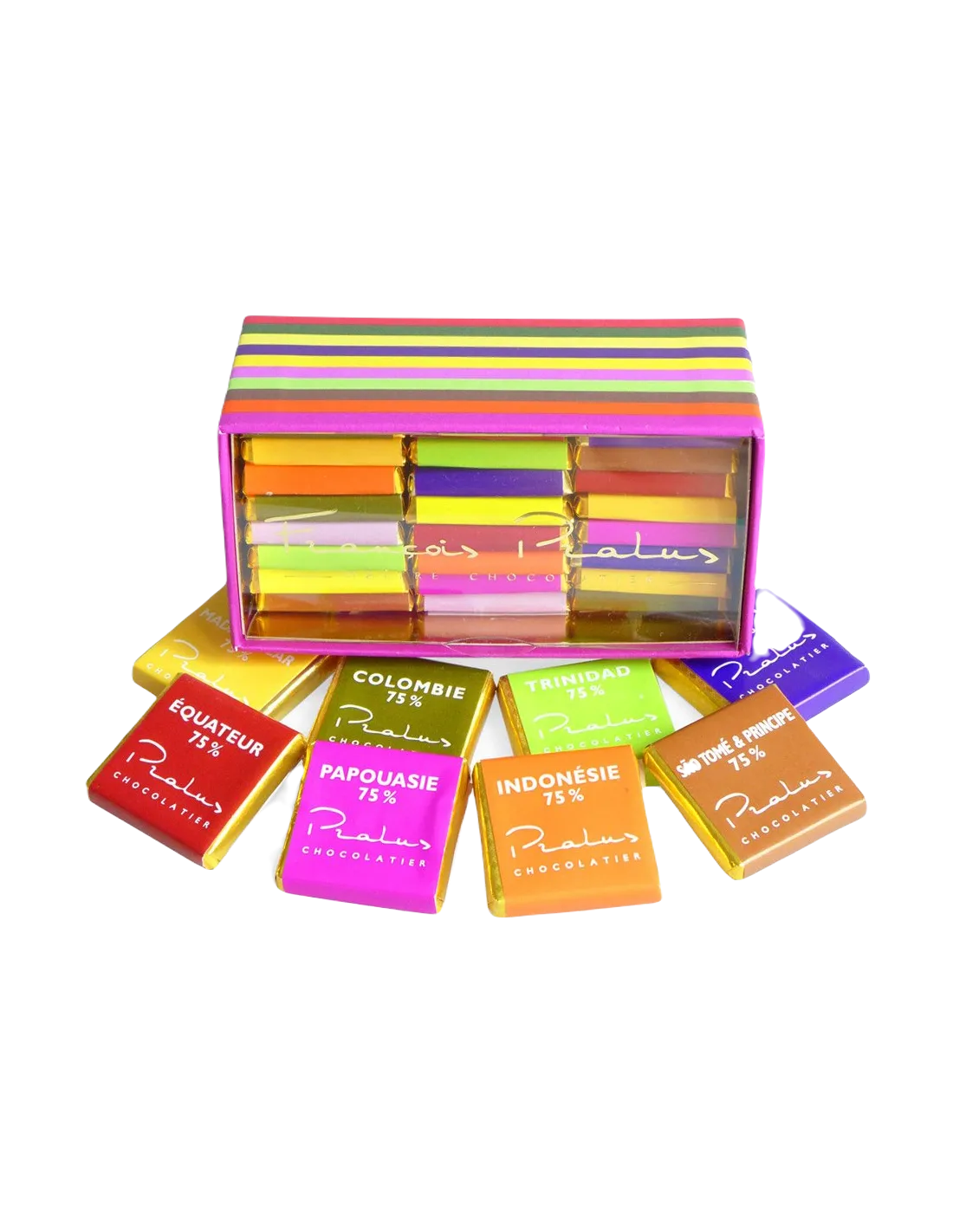 Kóstoló készlet a világ különböző régióiból származó 75%-os mini Francois Pralus csokoládékból.