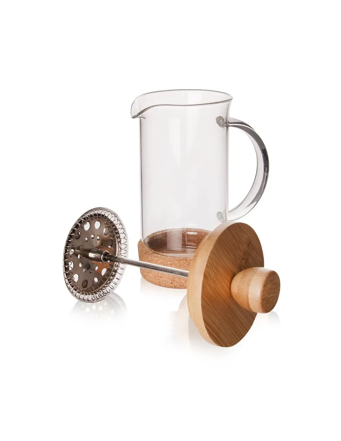 A Frenchpress teáskanna boroszilikát üvegből készült. A dugattyú rozsdamentes acélból, a fedél pedig bambuszból készült, ami ezt a vízforralót konyhája érdekes darabjává teszi. A teáskanna alján egy parafa párna található, amely szigetelésként szolgál, és eltávolítható.