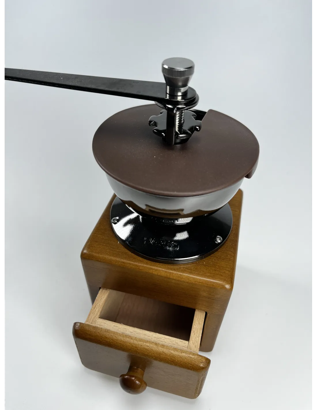 A Hario MM-2 kézi kávédaráló kerámia őrlőkövekkel, állítható őrlési durvasággal és praktikus fedéllel, amely megakadályozza, hogy a kávébabok őrlés közben elrepüljenek.
