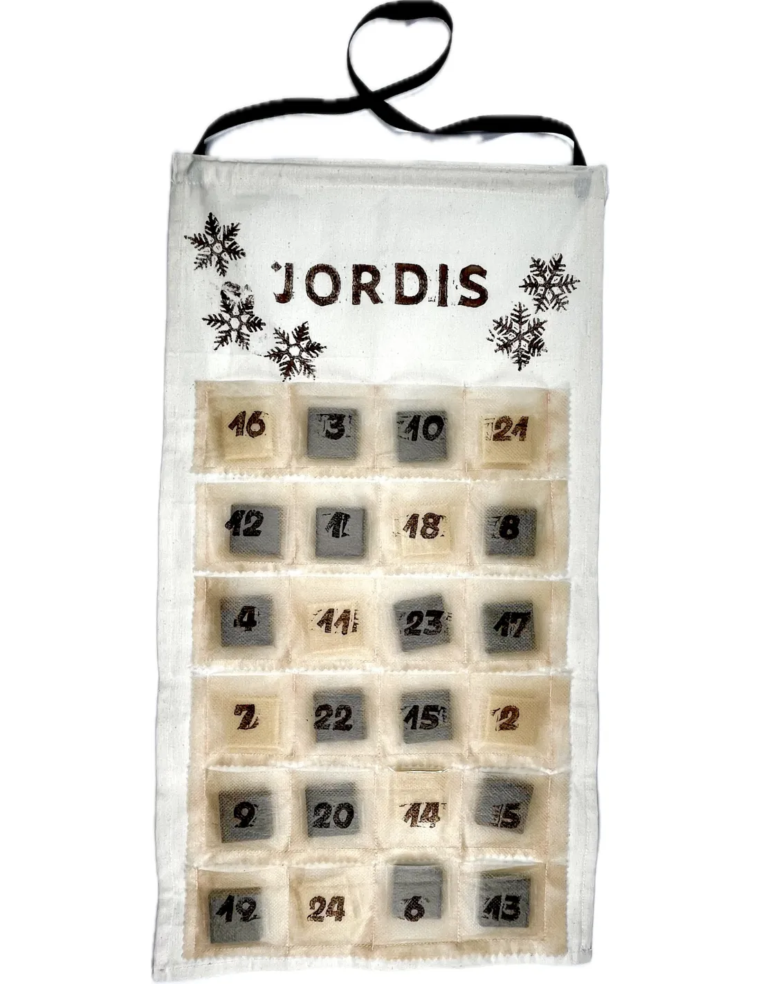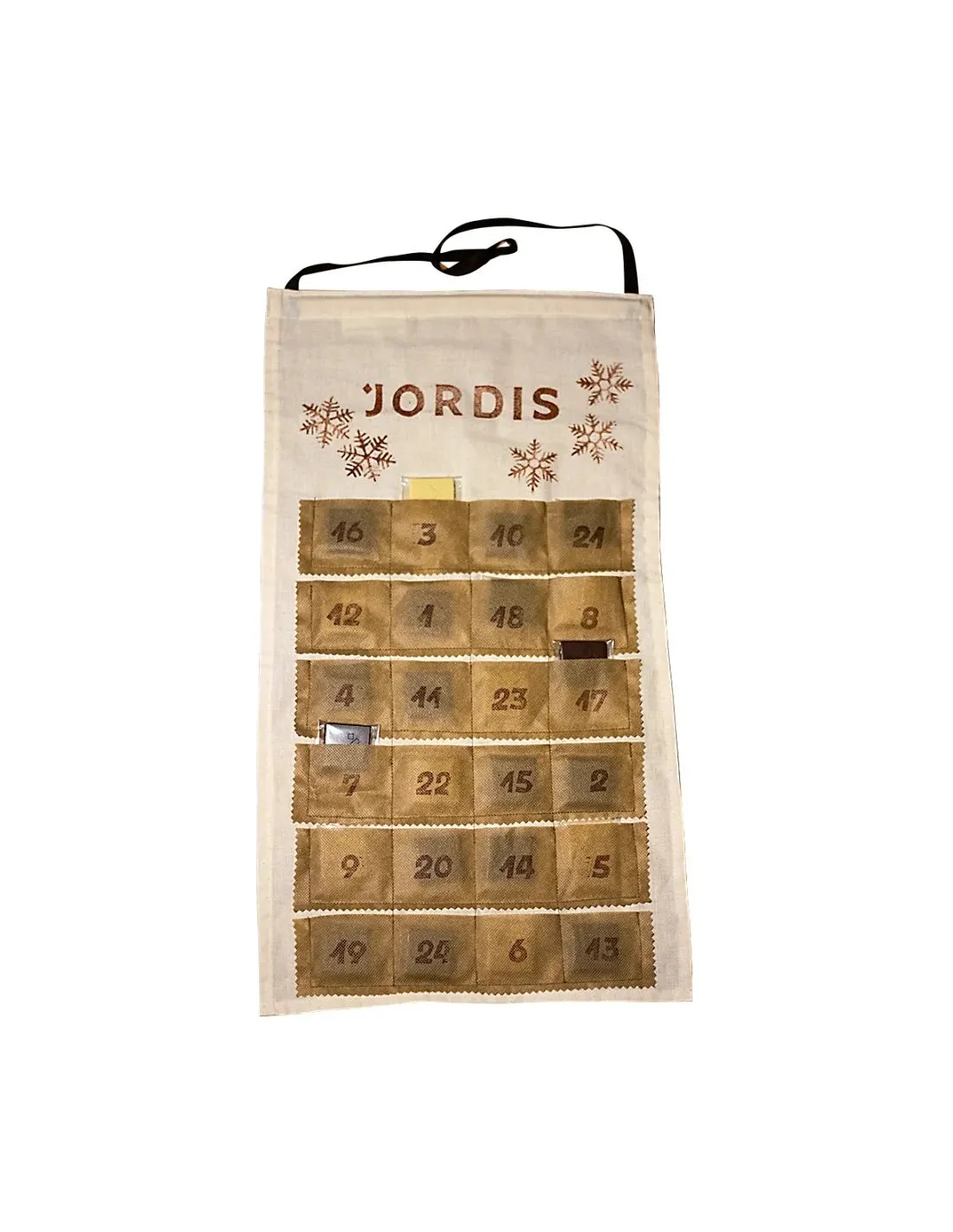 A Jordis Adventi naptár 24 ostyát tartalmaz (4 g tej, ét, fehér csokoládé) celofán zacskóba csomagolva.