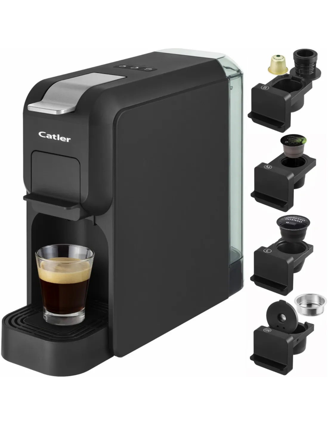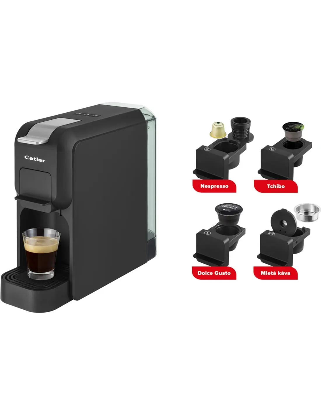 A 15 bar nyomásúautomata eszpresszó fekete, minimalista kivitelben gazdag ízű, intenzív aromájú és finom crema-t tartalmazó kávét készít. Kompatibilis a Nespresso®, Tchibo, NESCAFÉ® Dolce Gusto® és őrölt kávékapszulákkal .