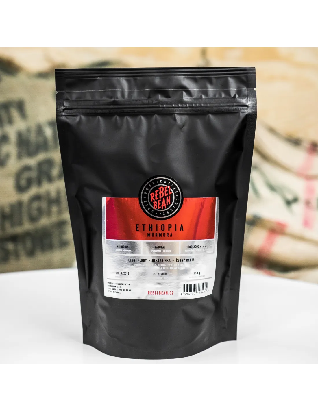 Kivételes választék és frissen pörkölt etiópiai Mormora kávé a brünni Rebelbean pörkölőből. Átlátszó eredet. Jelenlegi betakarítás. Mindig frissen pörkölt.
