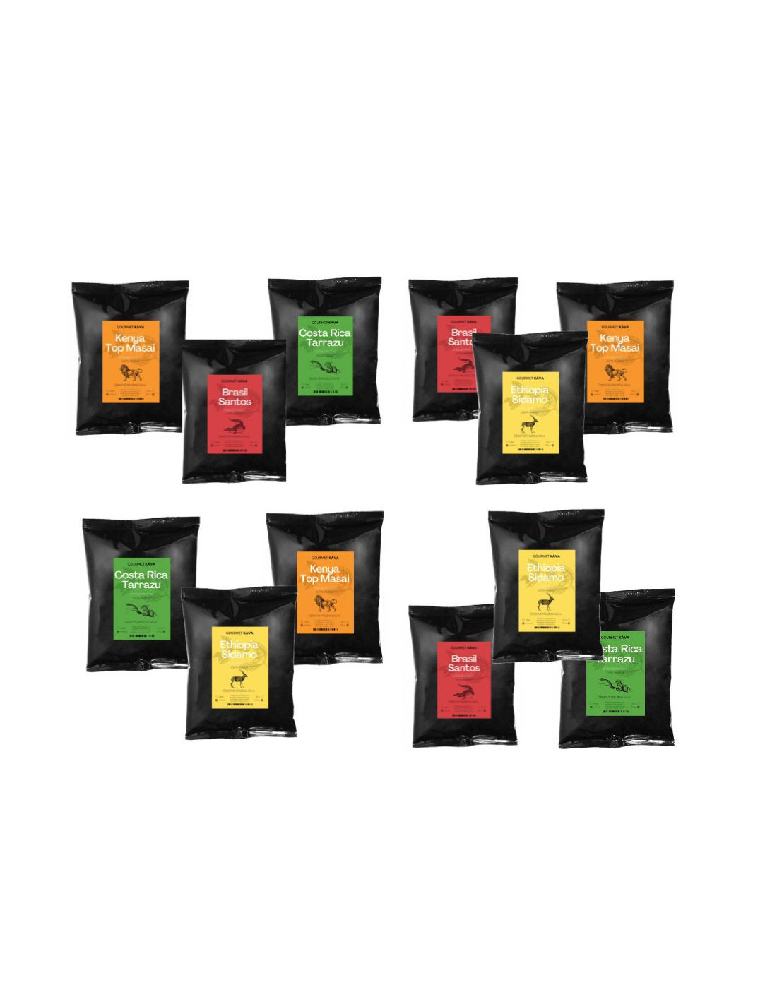 - 3x 250g Brazília Santos, 3x 250g Etiópia Sidamo, 3x 250g Costa Rica Tarrazú, 3x 250g Kenya Top Masai – mind közepesen pörkölt
