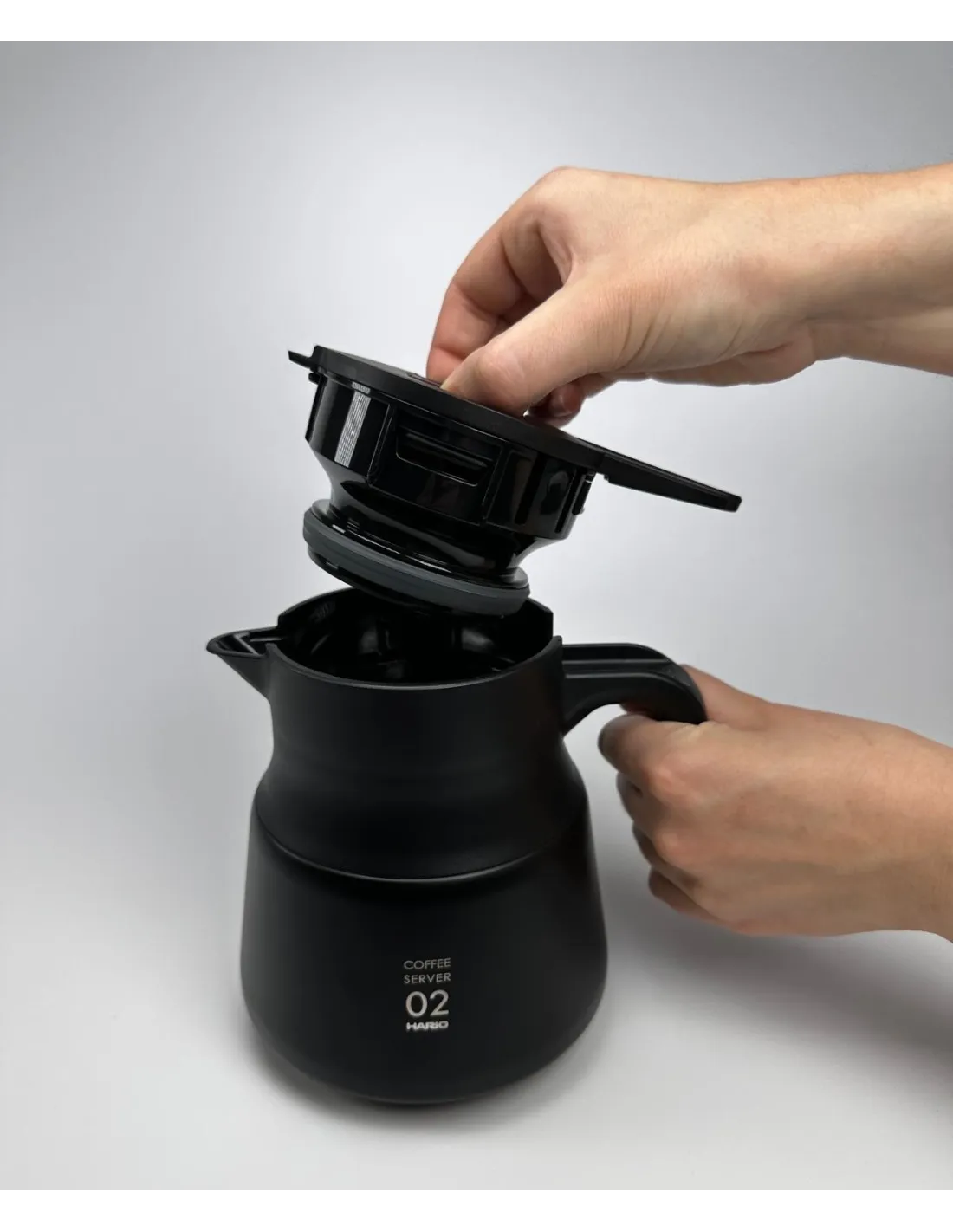 Végre megvannak a Hario V60 csepegtetők termosz tálaló edényei . A rozsdamentes acélból készült dupla falak ideálisak az ital hőmérsékletének 60 percig tartó fenntartásához , forró vízzel történő előmelegítés után akár 90 percig is. Ezek a praktikus és dizájnos szerverek átfolyó fedéllel és karral működtetett nyílással rendelkeznek , így melegen tartják, amíg készen nem áll az öntésre.