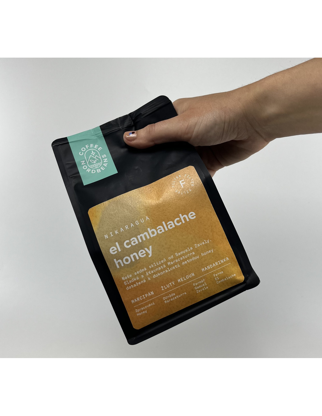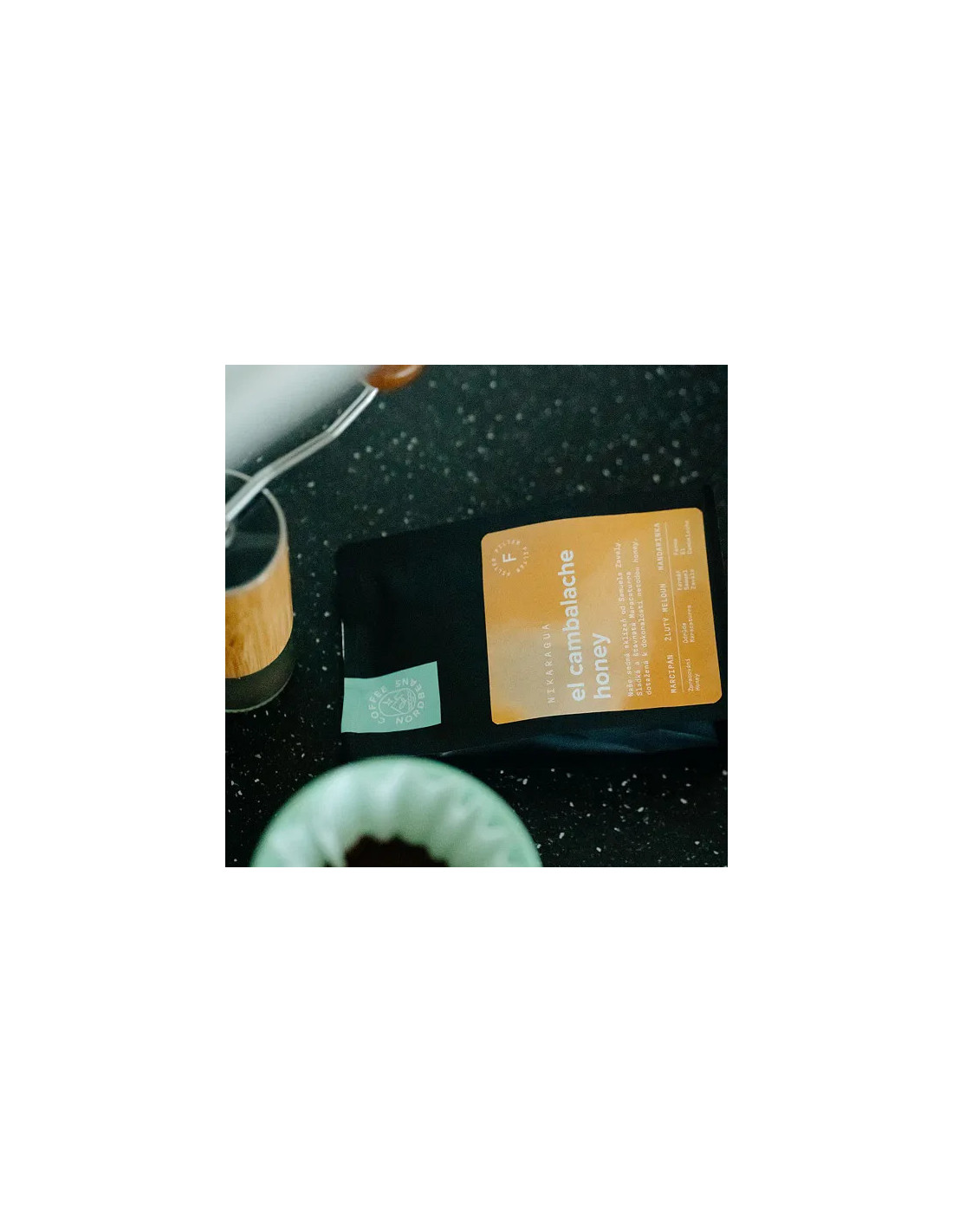El Cambalache Honey - Nicaraguából származó kávé (El Cambalache farm, mézes módszer), erős marcipán, sárga dinnye és mandarin jegyekkel.