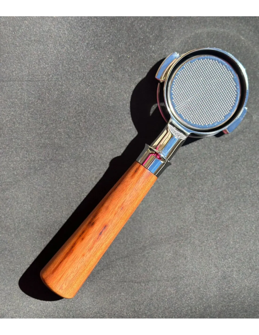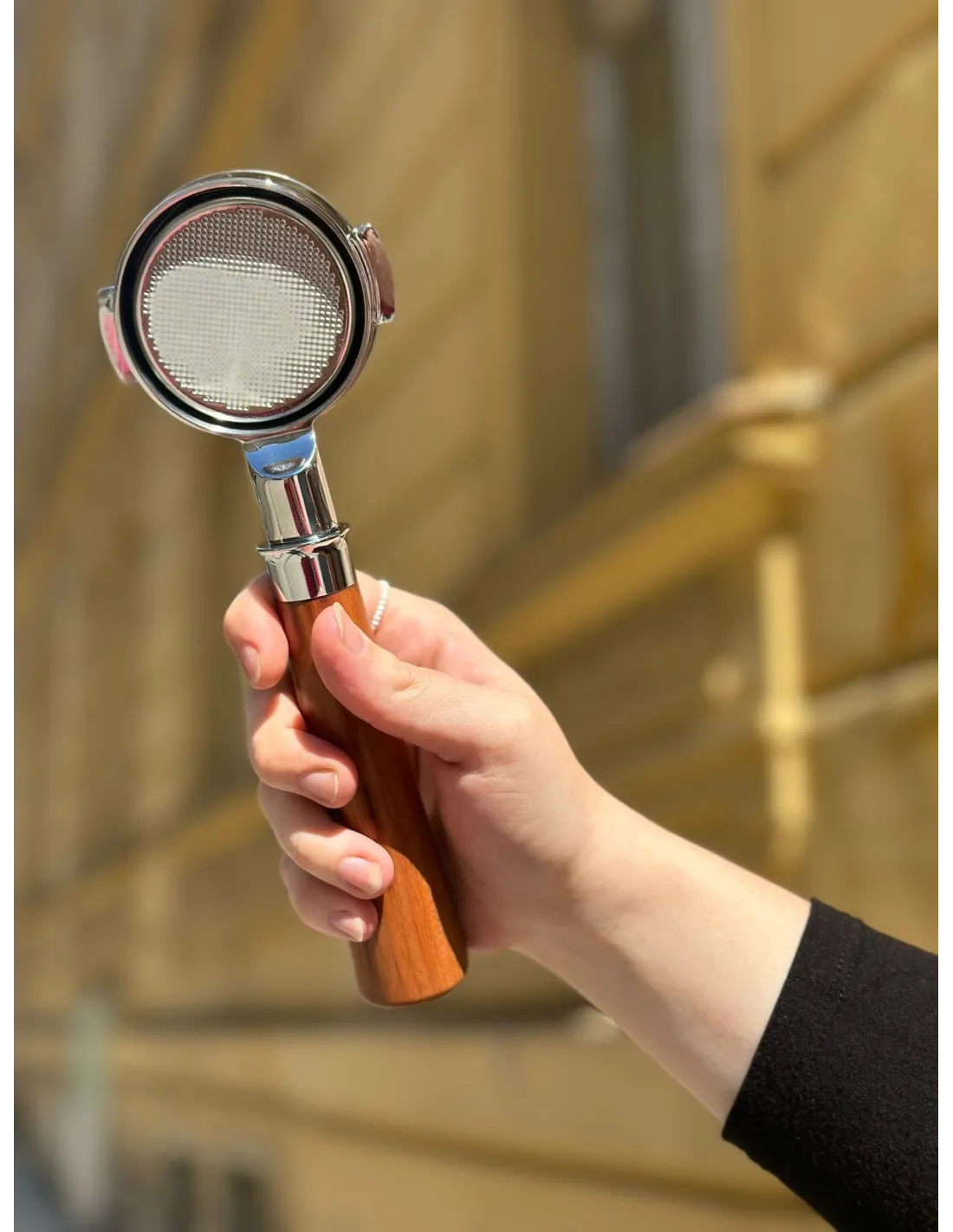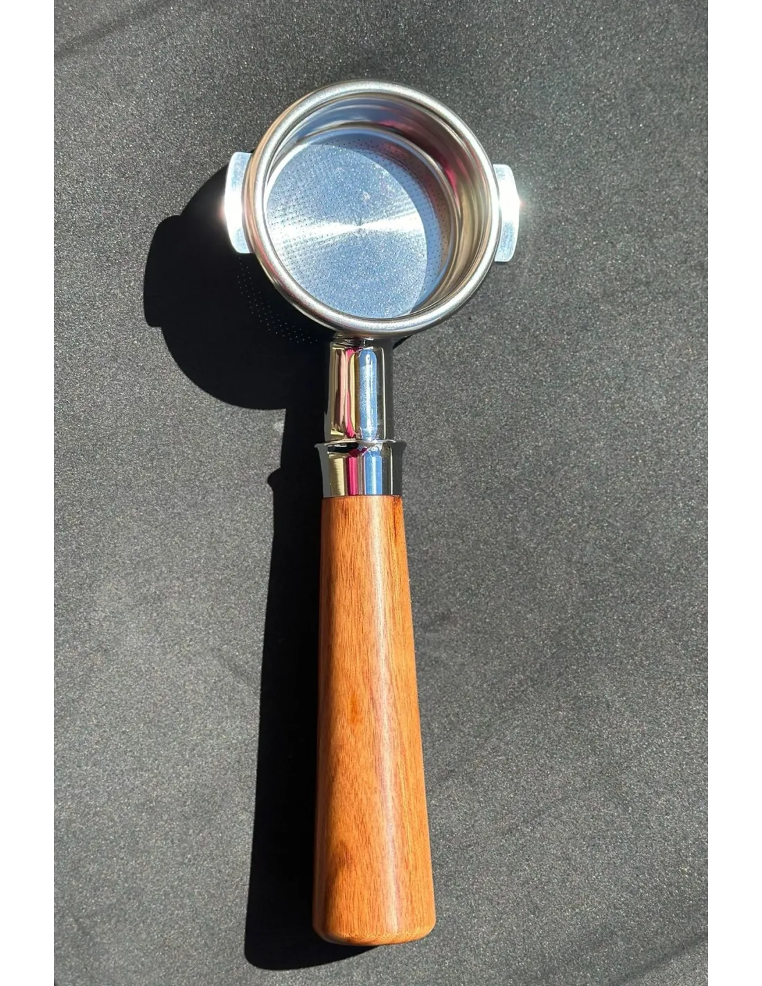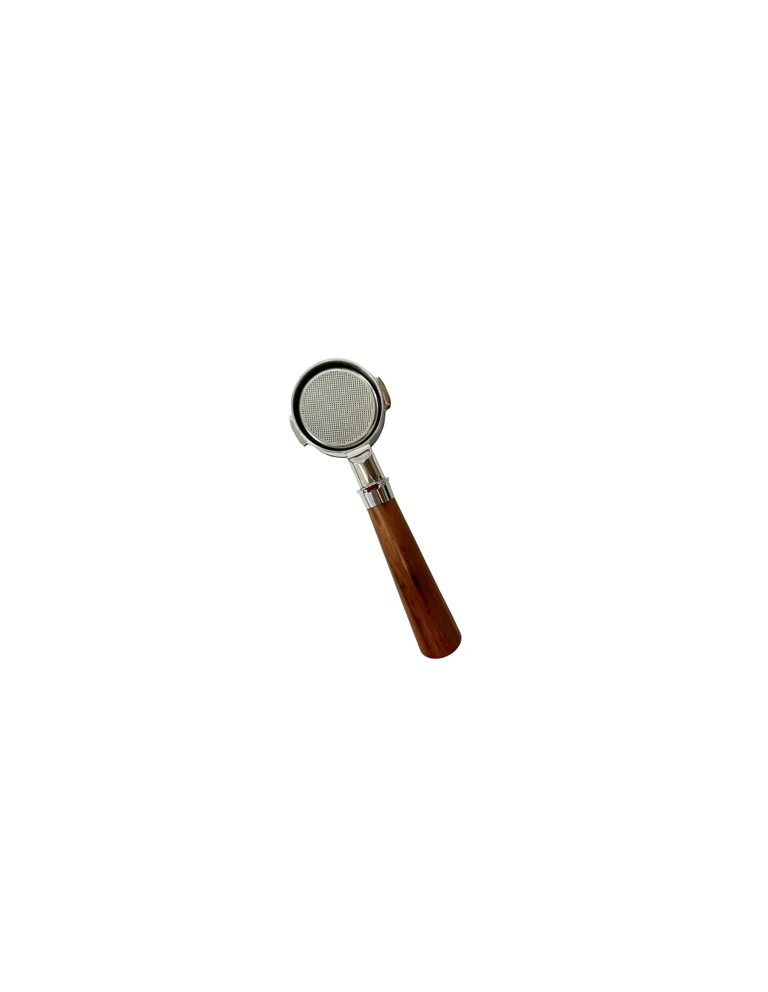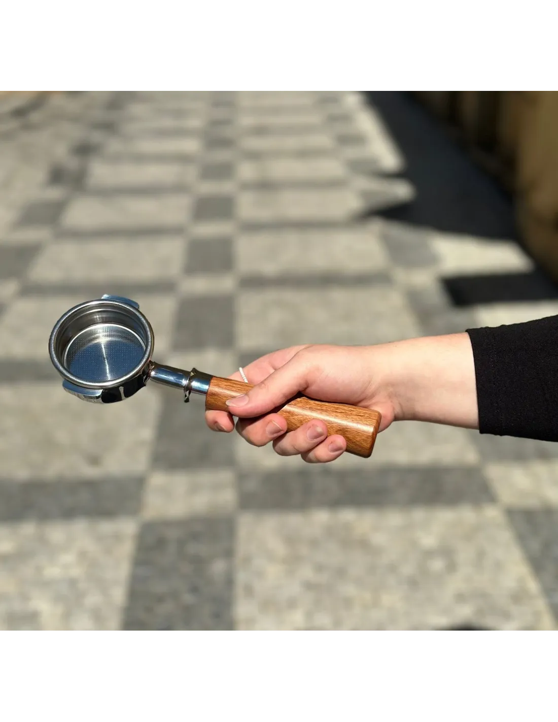 A Kaffia Bottomless Portafilter 58 mm-es csupasz kar krómozott sárgarézből készült, és kényelmes fa fogantyúval rendelkezik.