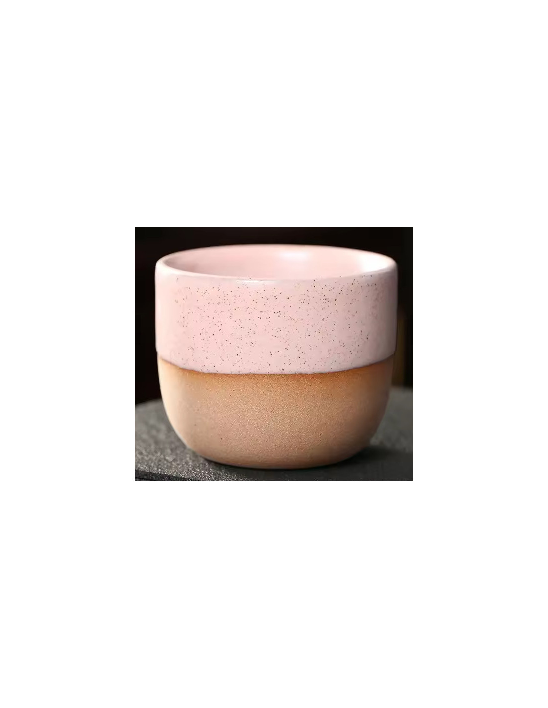 Elegáns kerámia csésze fogantyú nélkül, finom szórt mázzal. Kényelmesen illeszkedik a kézbe, és ideális eszpresszóhoz, lungóhoz vagy egy kisebb adag teához.