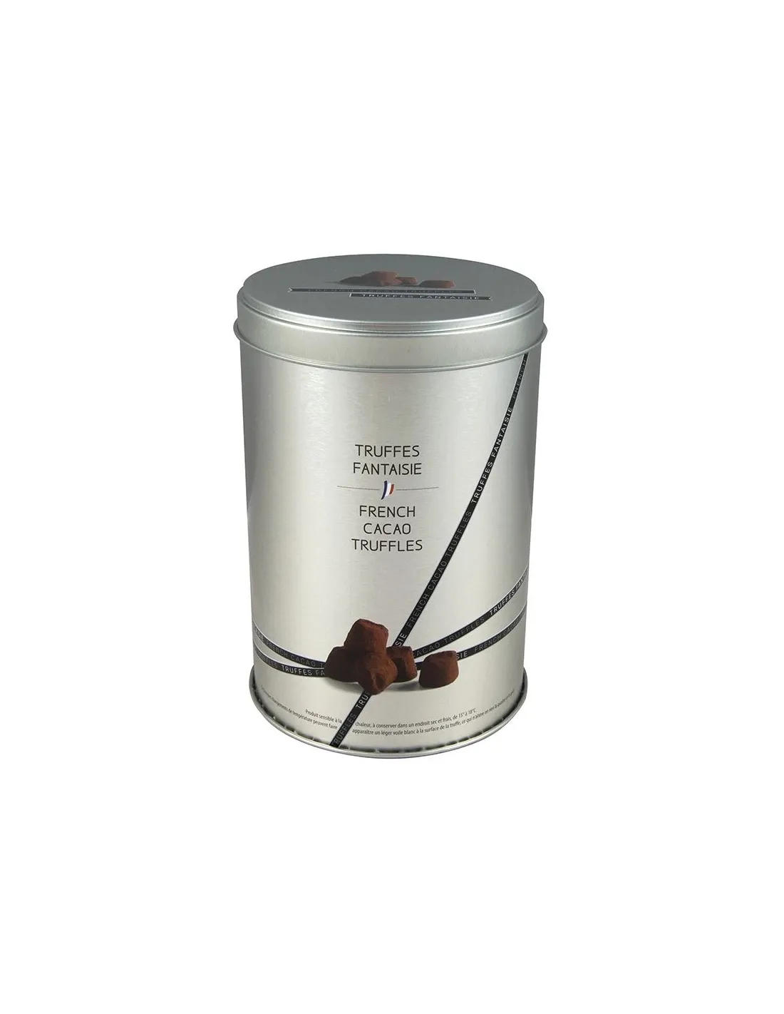 Finom Mathez Fantaisie kakaós trüffel sós karamellel, elegáns ezüst dobozban. Remekül illik kávéhoz vagy csak úgy szórakozásból.
