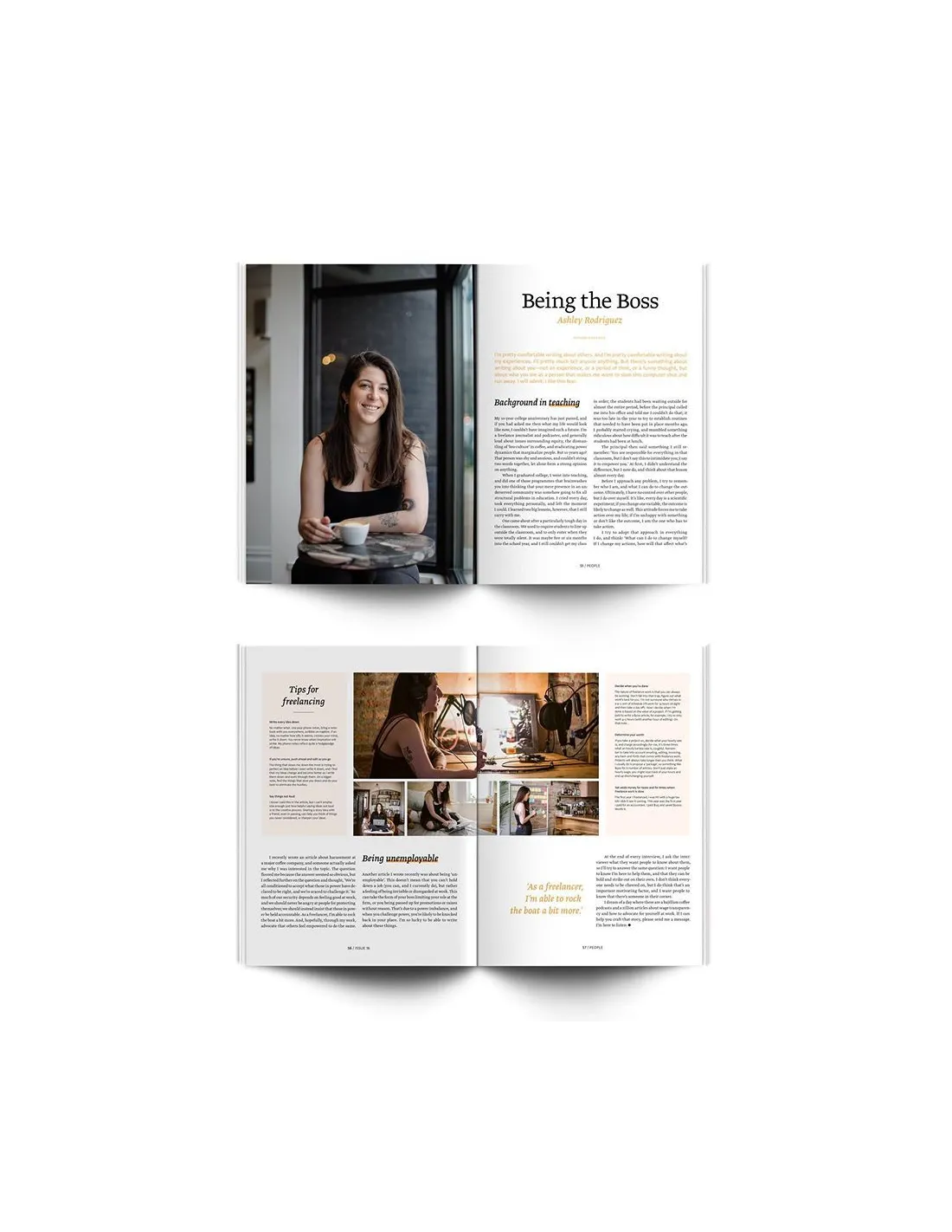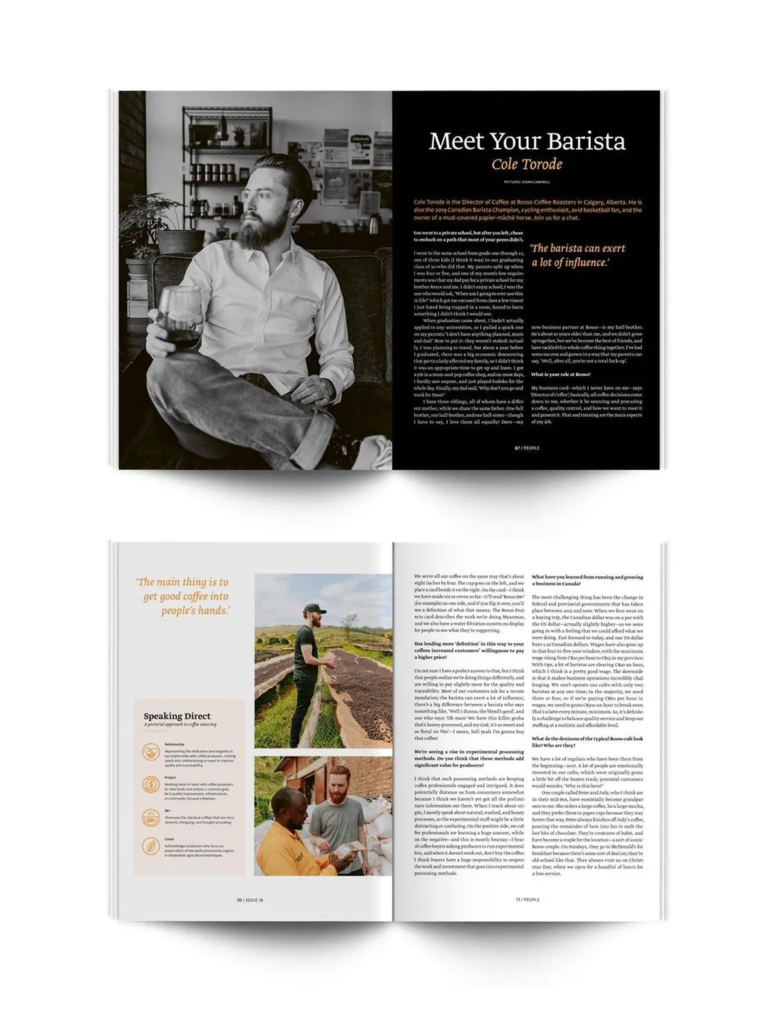 Az"Emberek" fejezet a kávé világát alkotó személyiségeket tárja fel. Ebben megismerkedhetünk Cole Torode kanadai barista mesterrel, aki bemutatja nekünk karrierjének kezdeteit, a versenyzést és a közvetlen kereskedelemmel kapcsolatos gondolatait. Ashley Rodriguez cikke a szabadúszó főnök szakmáját vizsgálja, és olyan tippeket és trükköket ad, amelyek segítettek neki tapasztalatot és önfegyelmet szerezni.