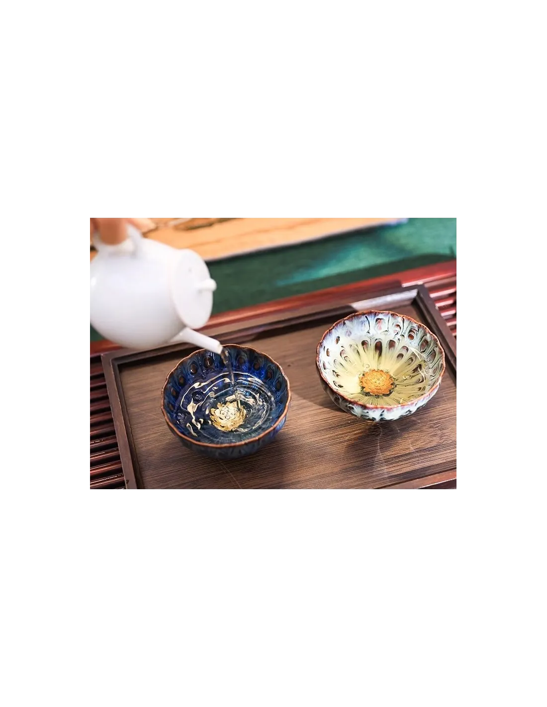 Stílusos Kaffia Blossom poharak, virágmotívumok ihlette, kézzel készített dizájnnal. Minden csésze alján egy finom lótusz motívum található, amely világos vagy tiszta tea öntésekor tűnik ki a legjobban.