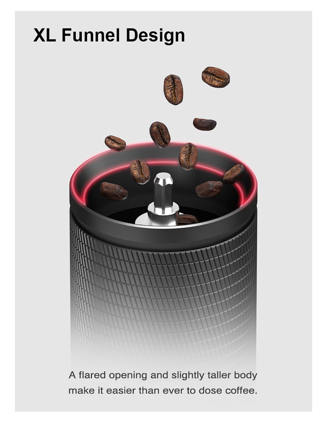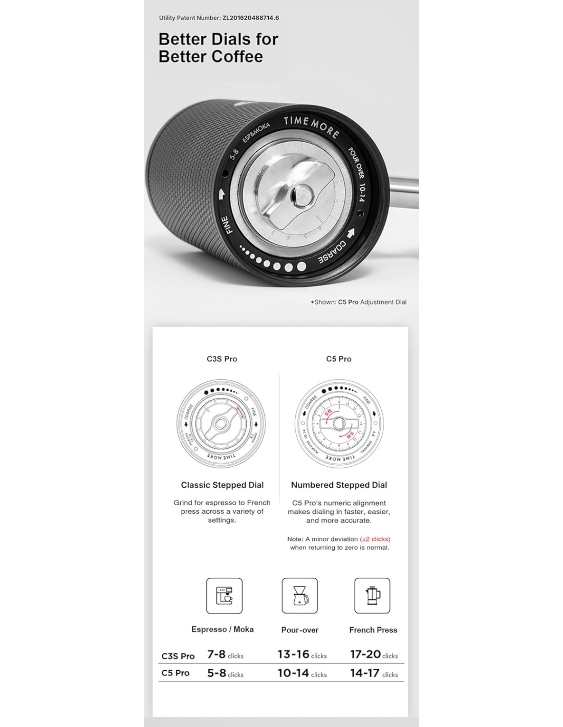 Minden egyes forgattyú mindössze 0,031 mm elmozdulásnak felel meg, ami rendkívül pontos beállítást garantál. Az alumíniumötvözetből és rozsdamentes acélból készült robusztus test tökéletes stabilitást és tartósságot biztosít, míg a szilikon talp megakadályozza a csúszást őrlés közben.