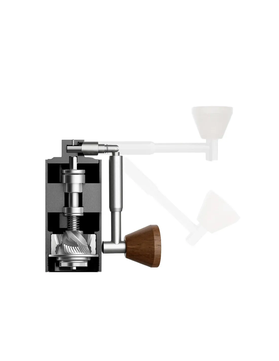 A daráló a tömörségre is hangsúlyt fektet, ezért egyedi, összecsukható fogantyúval rendelkezik . Az utazók értékelni fogják a daráló méretét is. Mindössze 10 cm-es, és az alumíniumnak köszönhetően nagyon könnyű is. A faragott textúrának köszönhetően őrlés közben könnyen megfogható, a fogantyú pedig gyönyörű és tartós diófából készült.