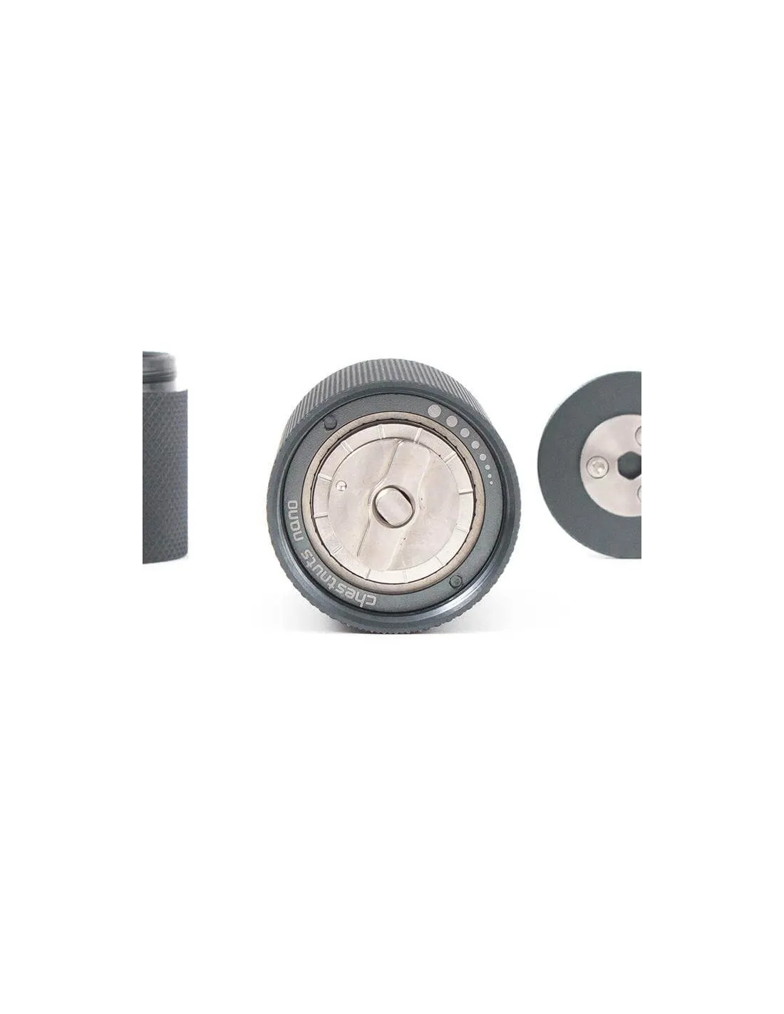 A Timemore Nano egy kompakt , kiváló kivitelezésű, egyetlen darab alumíniumból készült kis daráló. Ideális utazáshoz. A daráló precíziós edzett acél kúpos kövekkel és 2 csapággyal van felszerelve, amelyek rendkívül pontos és állandó őrlést tesznek lehetővé. A daráló alján található forgó anyával könnyen beállítható a durvaság.