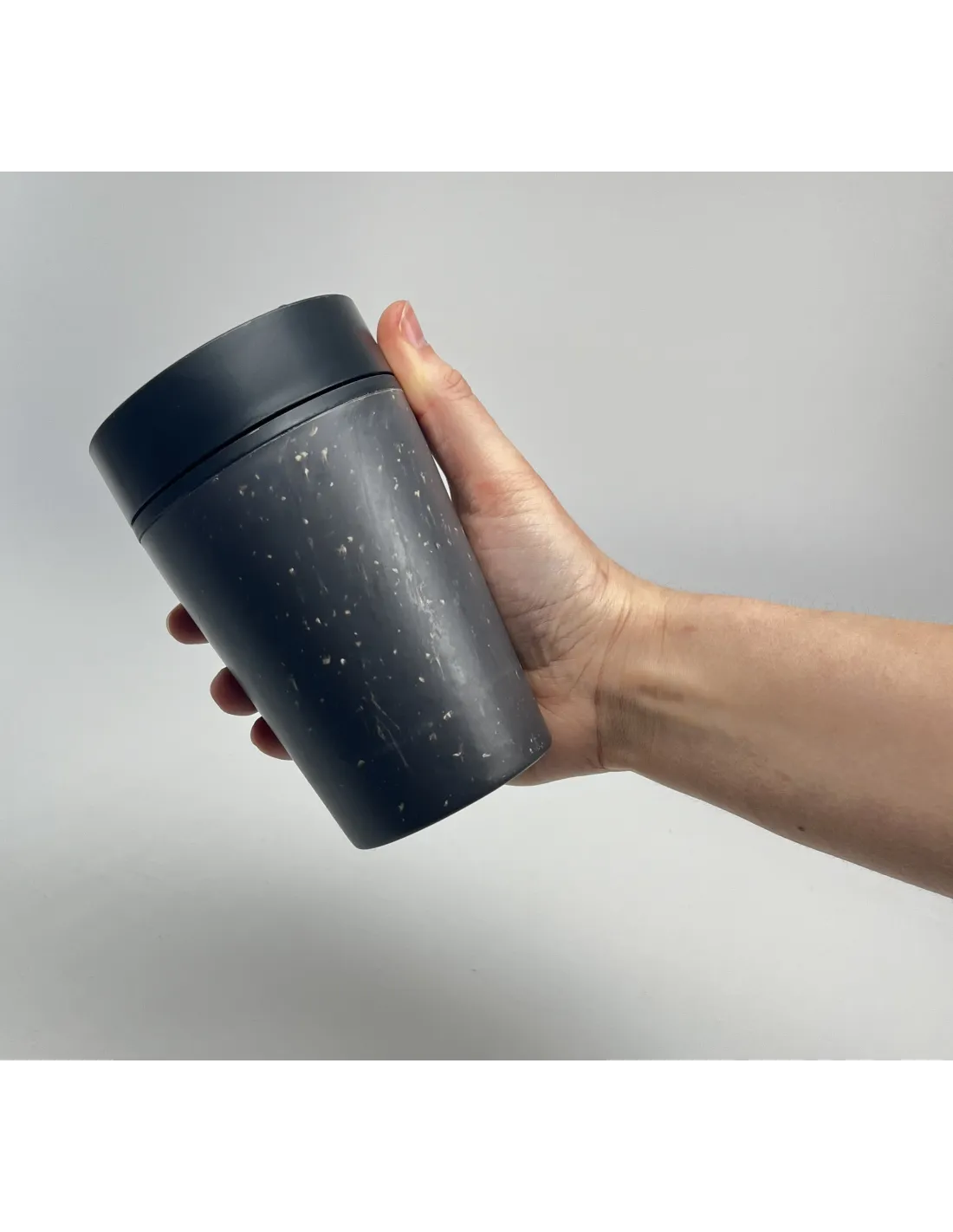 Újrahasznosított poharakból készültdesign pohár, praktikus és kényelmes használat. A szürke és a tinta fekete elegáns kombinációja. Fenntartható és stílusos!