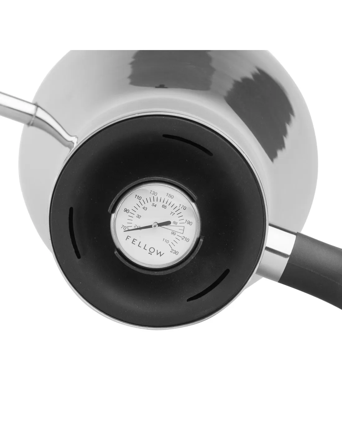 Fellow Stagg 1L-esvízkanna beépített hőmérővel és kiöntővel, amelyet kifejezetten az alternatív kávékészítmények pontos kiöntéséhez terveztek. Ezüst színű.