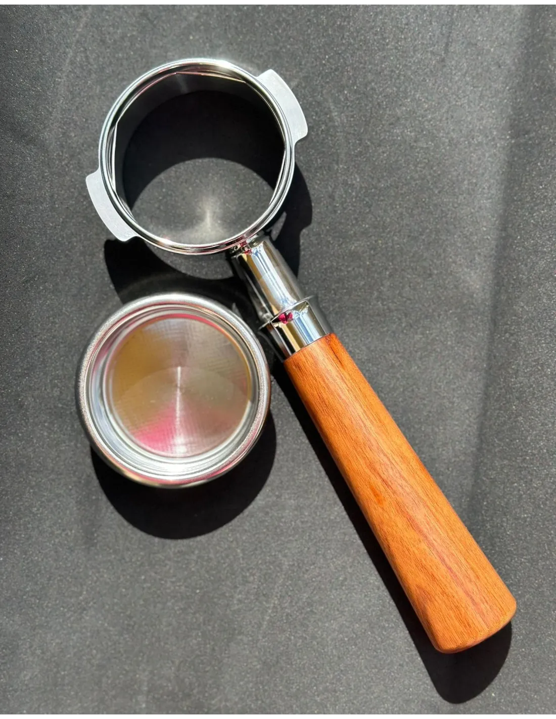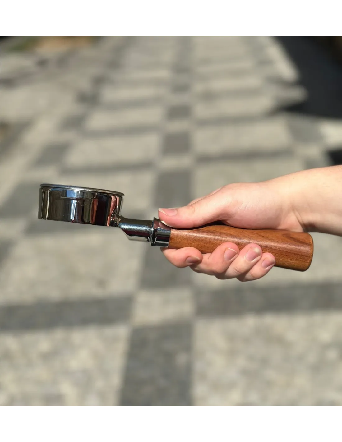 Naga dźwignia Kaffia Bottomless Portafilter 58 mm jest wykonana z chromowanego mosiądzu i ma wygodny drewniany uchwyt.