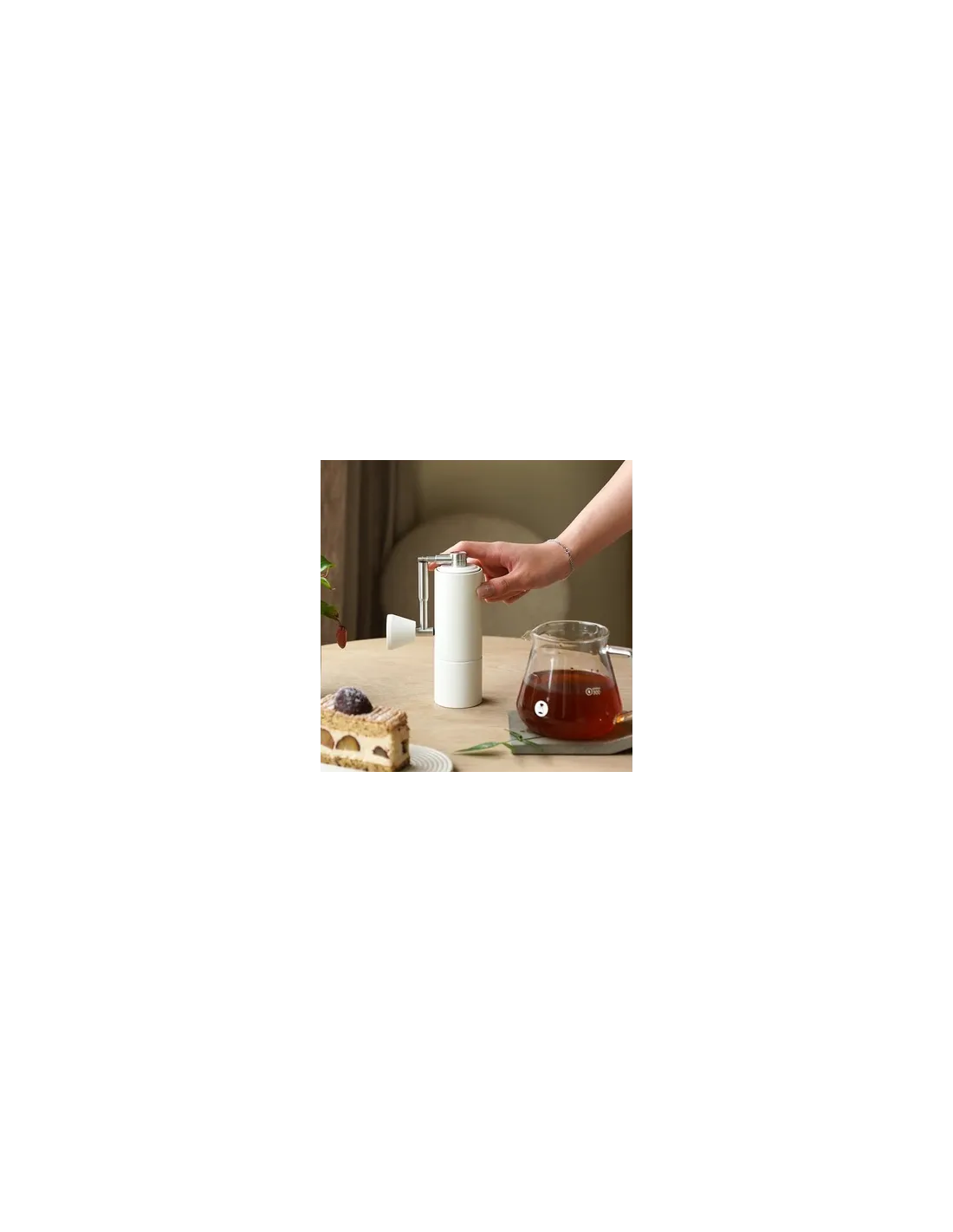 Młynek jest wyposażony w precyzyjne stalowe kamienie i dwa łożyska, które zapewniają wysoką precyzję i spójność mielenia. Grubość mielenia można łatwo regulować za pomocą nakrętki obrotowej znajdującej się na spodzie młynka. Obrót w kierunku przeciwnym do ruchu wskazówek zegara zapewnia drobniejsze mielenie, natomiast obrót w kierunku zgodnym z ruchem wskazówek zegara zapewnia grubsze mielenie kawy. Podczas regulacji stopnia zmielenia należy pamiętać o założeniu uchwytu, aby zapobiec obracaniu się osi.